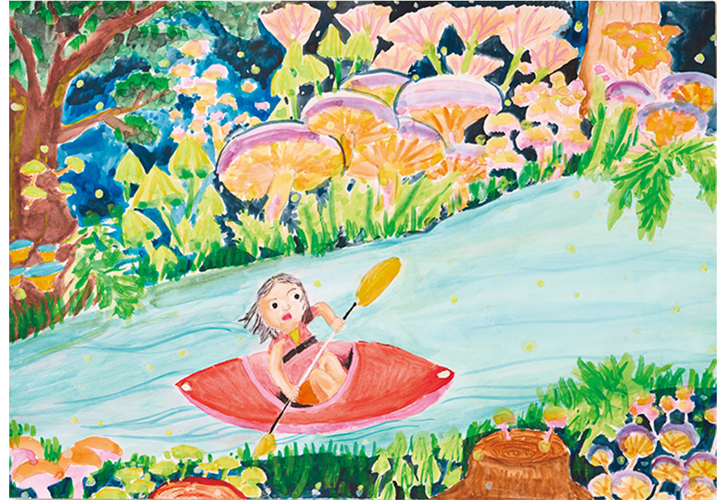 いつか行ってみたい光景を描きました。蛍や光るキノコが川の案内をしてくれているような幻想的な場所です。発光塗料で描きました。暗くすると光ります。